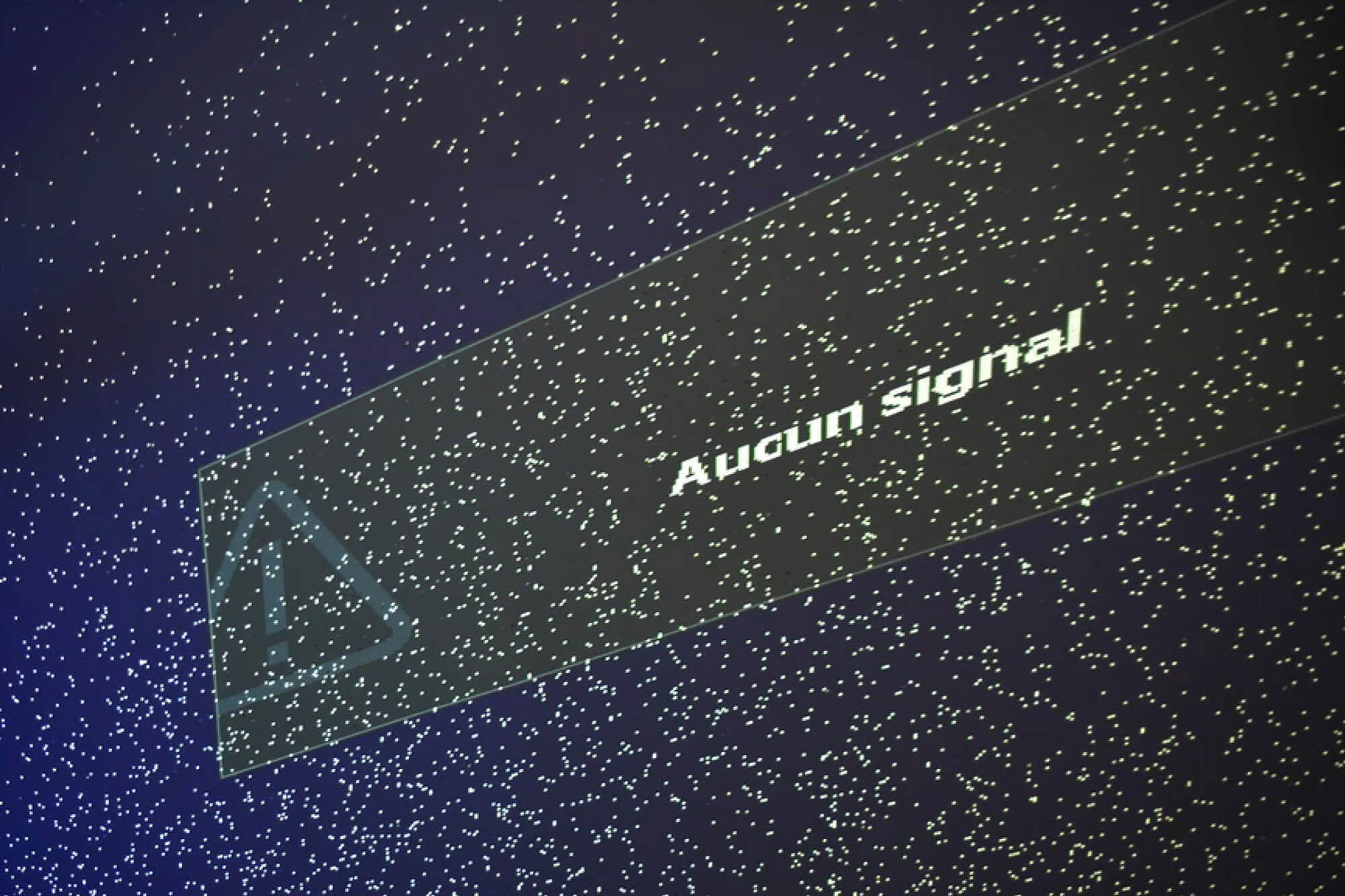 Je peux parler de Vidéoprojecteur, le début de la pièce date de cette période. Je dis “Début” parce que ce processus est toujours en cours, avec plusieurs machines. C’est un protocole de “laisser vivre” ou d’épuisement de la machine. Je me procure des vidéoprojecteurs considérés comme en fin de vie, car les écrans LCD qu’ils contiennent perdent leurs pixels. Ceux-ci ne filtrent plus le rouge, le vert ou le bleu mais se contentent de laisser passer les trois couleurs, produisant de la lumière blanche. Ce qui laisse apparaître sur la projection des points blancs, de plus en plus nombreux, certains clignotant encore avant de se figer. Aucun signal n’est envoyé dans le projecteur. Il est simplement branché, allumé et projette son écran d’accueil bleu, parfois noir, précisant qu’aucune source n’est connectée. Je m’amuse de cette mention “no signal” — l’univers est trop grand, le signal ne nous est pas encore parvenu, ou bien on n’y capte pas de traces de vie similaire à la nôtre. Avec le temps donc, le processus est inéluctable, l’image sera un rectangle de lumière blanche, le ciel sera trop lumineux, éclairé par une titanesque supernova… fiat lux n’est jamais très loin. Plus pragmatiquement, le projecteur sera une grosse lampe.