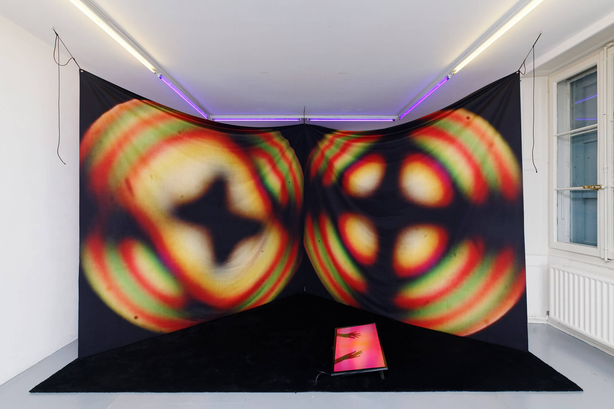 Carin Klonowski, TLCD, performance et installation (impressions textile, moquette, vidéo sur écran), 2018-2019.