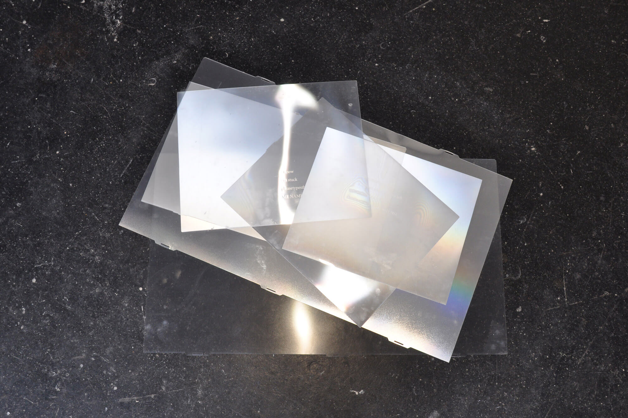Carin Klonowski, SCR (from nghtbsd_7), gravure laser sur films polariseurs, 2021.