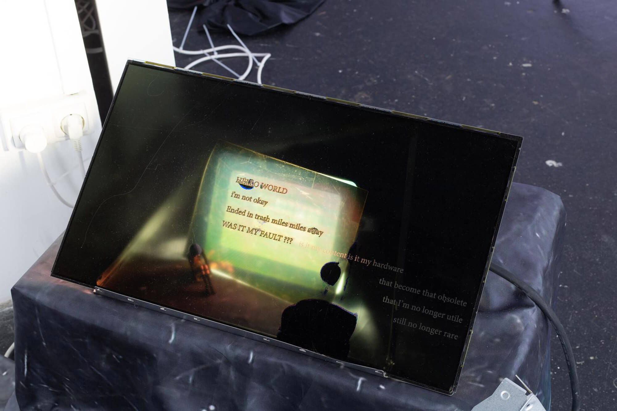 Est-ce pour cela que tu vas chercher dans la ruine et les décombres — pour ne plus “produire” mais manipuler, transformer ? Comme dans ton dernier travail Blackscreen Issues, Sleeping Displays, où tu graves des poèmes sur des pièces d’écrans de smartphones, tablettes, téléviseurs avant leur destruction. Dans cette installation, on sent quelque chose de très sombre, on est dans les limbes.